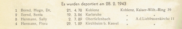Am 28. Februar 1943 wurden der Arzt Dr. Hugo Bernd mit seiner Ehefrau Senta und das Ehepaar Sally und Flora Hermann in das Vernichtungslager Auschwitz-Birkenau deportiert und dort mit Giftgas ermordet. Sie waren zunächst noch in Koblenz verblieben, weil sie den Nazis für die Deportationen der anderen Juden nützlich waren. Dr. Hugo Bernd hatte sich als letzter in Koblenz verbliebener Arzt um die nur noch sehr eingeschränkt mögliche medizinische Versorgung der Juden gekümmert. Er betreute sie bei den vier großen Deportationen und behandelte die in Koblenz noch lebenden Juden. Als er nicht mehr gebraucht wurde, wurden auch er und seine Frau „nach dem Osten“ deportiert und mit Giftgas ermordet. Dasselbe Schicksal erlitten die Eheleute Sally und Flora Hermann. Sie hatten bis zuletzt das Sekretariat der Jüdischen Gemeinde in Koblenz verwaltet – und notgedrungen bei den Maßnahmen der Gestapo mitwirken müssen. Nachdem die allermeisten Juden deportiert worden waren und die Jüdische Gemeinde aufgehört hatte zu existieren, wurden auch sie nicht mehr benötigt und ebenfalls ins Giftgas geschickt.