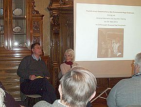 Der "erzählende Vortrag/Erzählcafé" von Julianna Salzmann und Joachim Hennig am 20. März im Schlossparkmuseum in Bad Kreuznach war rundherum gelungen. Herr Räpple von der Stiftung Haus der Stadtgeschichte Bad Kreuznach konnte ein volles Haus begrüßen. Die über 50 Gäste, die zum Teil auch aus der näheren Umgebung gekommen waren, erlebten dabei Stadtgeschichte zum Anfassen. Das begann schon damit, dass Frau Salzmann einige Skulpturen ihres Vaters in der Runde herumreichte und diese beschrieb. Sodann berichtete sie mit vielen historischen Fotos und assistiert von Joachim Hennig über das Leben und Wirken ihres Vaters, die Verfolgung und Emigration ihres Vaters und seiner Frau Julianna und vom Tod ihrer Namensgeberin im Frauen-Konzentrationslager Ravensbrück. Mit großem Interesse und mit Anteilnahme verfolgten die Gäste die Stationen seines Lebens und wie sich in ihnen vor der NS-Diktatur und dann auch wieder danach die Heimatgeschichte widerspiegelte. Immer wieder griff das Publikum die dargebotenen Bilder und Geschichten auf und brachte sich und die eigene Erinnerung in die Erzählung ein. Zwei Stunden lang wurde das Leben des Kommunisten, Gewerkschafters und Künstlers Hugo Salzmann und seiner Familie wieder lebendig. Auch noch danach suchten Bekannte und Verwandte der erst vor zwei Jahren verstorbenen dritten Frau Salzmanns, Maria Salzmann, den Kontakt zur Tochter. So gab es noch danach ein vielstimmiges "hallo". Viel zu früh musste man auseinander gehen, aber die Zeit war schon sehr fortgeschritten. Es war sicherlich für zahlreiche Kreuznacher ein Erlebnis - auch für Julianna Salzmann, die schon an ein Treffen in privaterem Rahmen denkt.